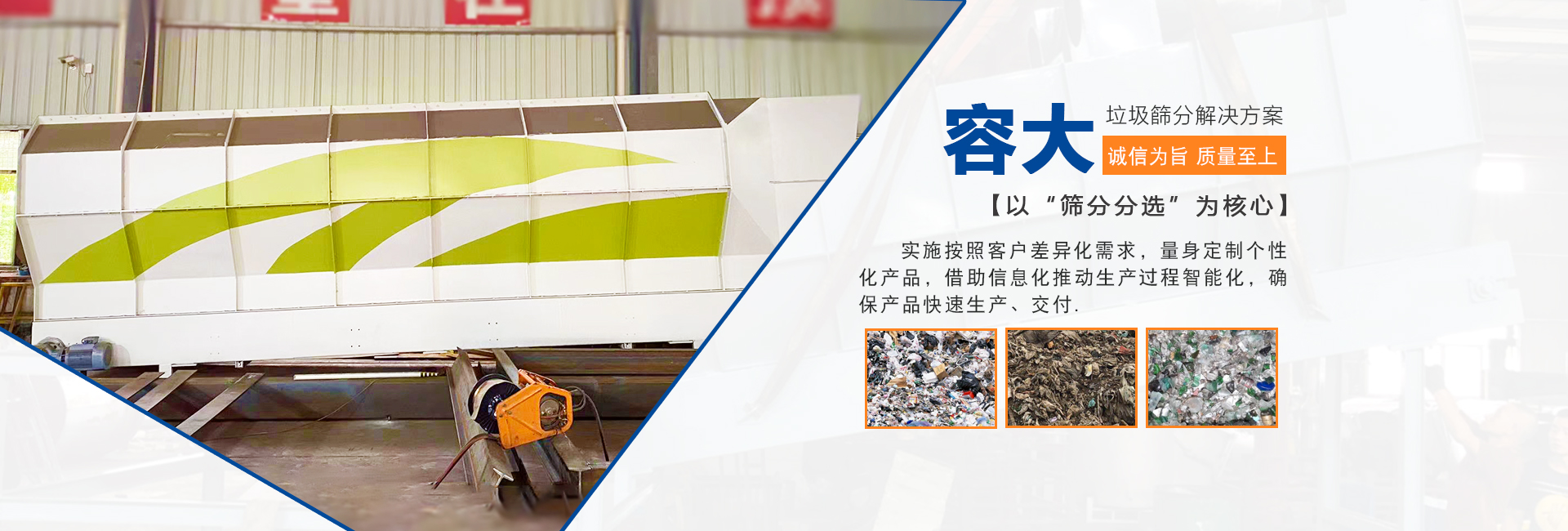 泉州容大機(jī)械有限公司是一家專研生活垃圾分選的企業(yè),以“篩分分選”為核心,實(shí)施按照客戶差異化需求,量身定制個(gè)性化產(chǎn)品,柔性化生產(chǎn)管理模式,以智能制造為主攻方向,以客戶需求為中心,借助信息化推動(dòng)生產(chǎn)過程智能化,確保產(chǎn)品快速生產(chǎn)、交付。生活垃圾處理領(lǐng)域內(nèi)的技術(shù)研究,利用篩分、分選技術(shù)的核心競爭力,圍繞“智能、高效、節(jié)能、環(huán)保”八個(gè)大字為中心,為循環(huán)經(jīng)濟(jì)項(xiàng)下的各種生活垃圾處理項(xiàng)目提供成套的技術(shù)解決方案 ...